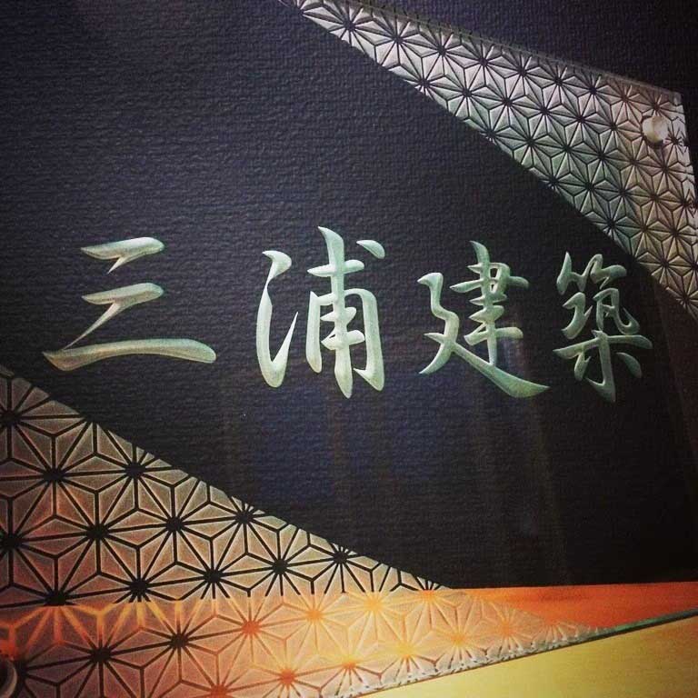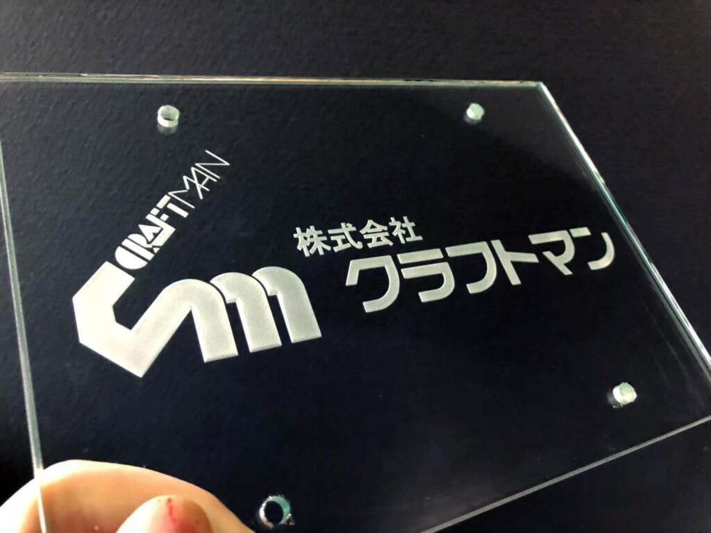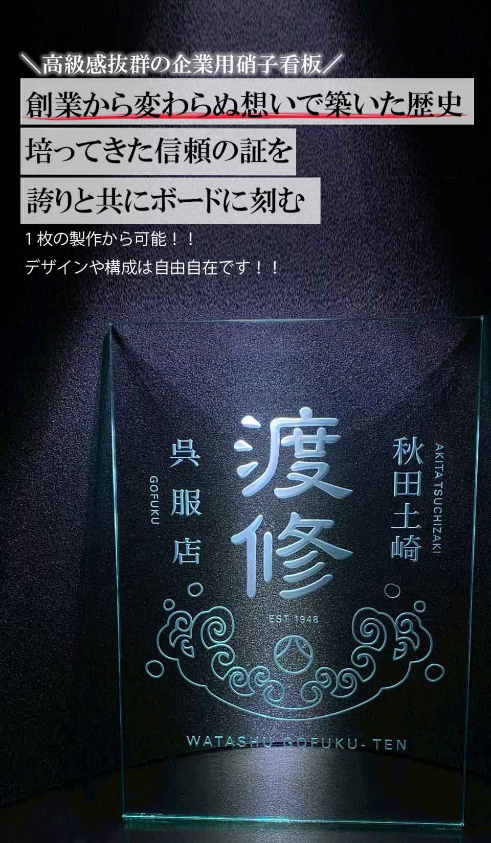 当社の硝子彫刻看板は、社名・ロゴ・理念・創業年・代表者名などを、全てをフルオーダーデザインでレイアウトできます。