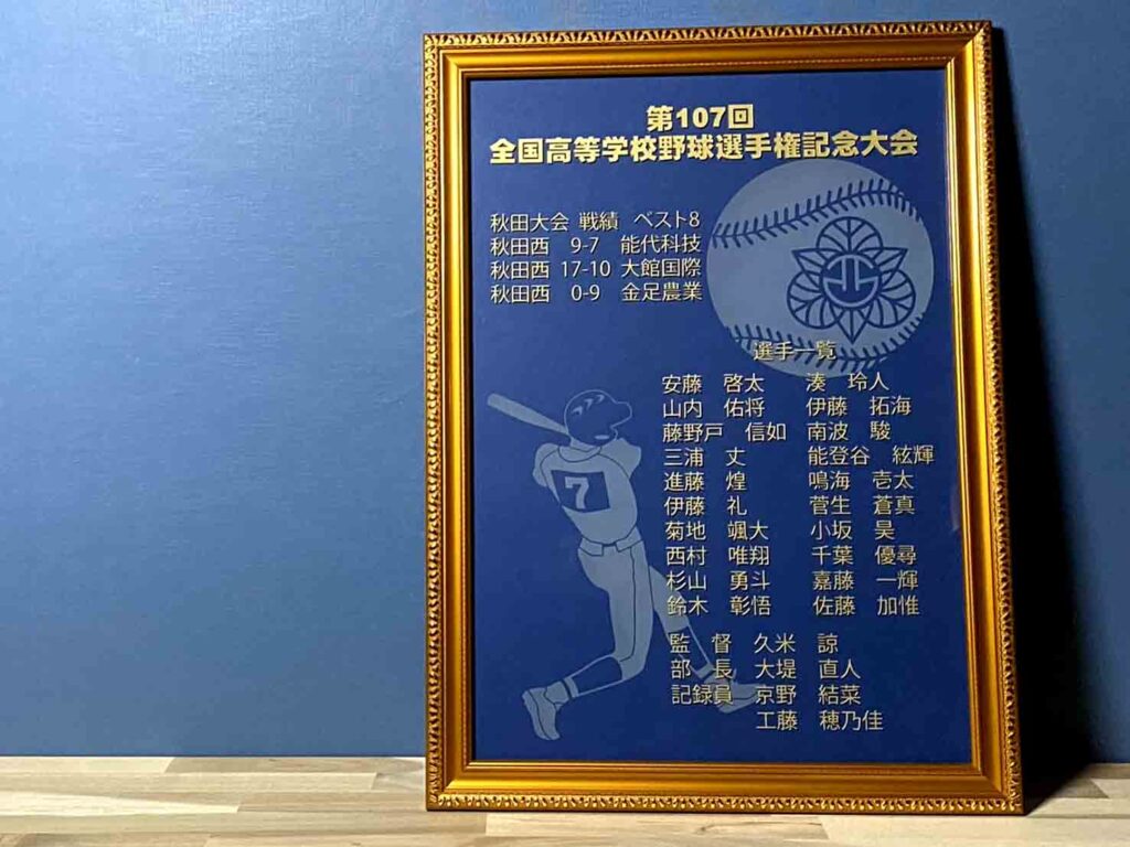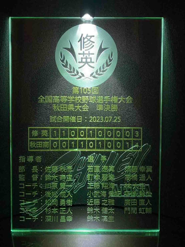 彫刻の依頼内容としましては、学校の校章と野球部のロゴを入れたい。秋田県大会最終戦のスコアボードと指導陣&メンバー全員の名前を入れたいと依頼しました