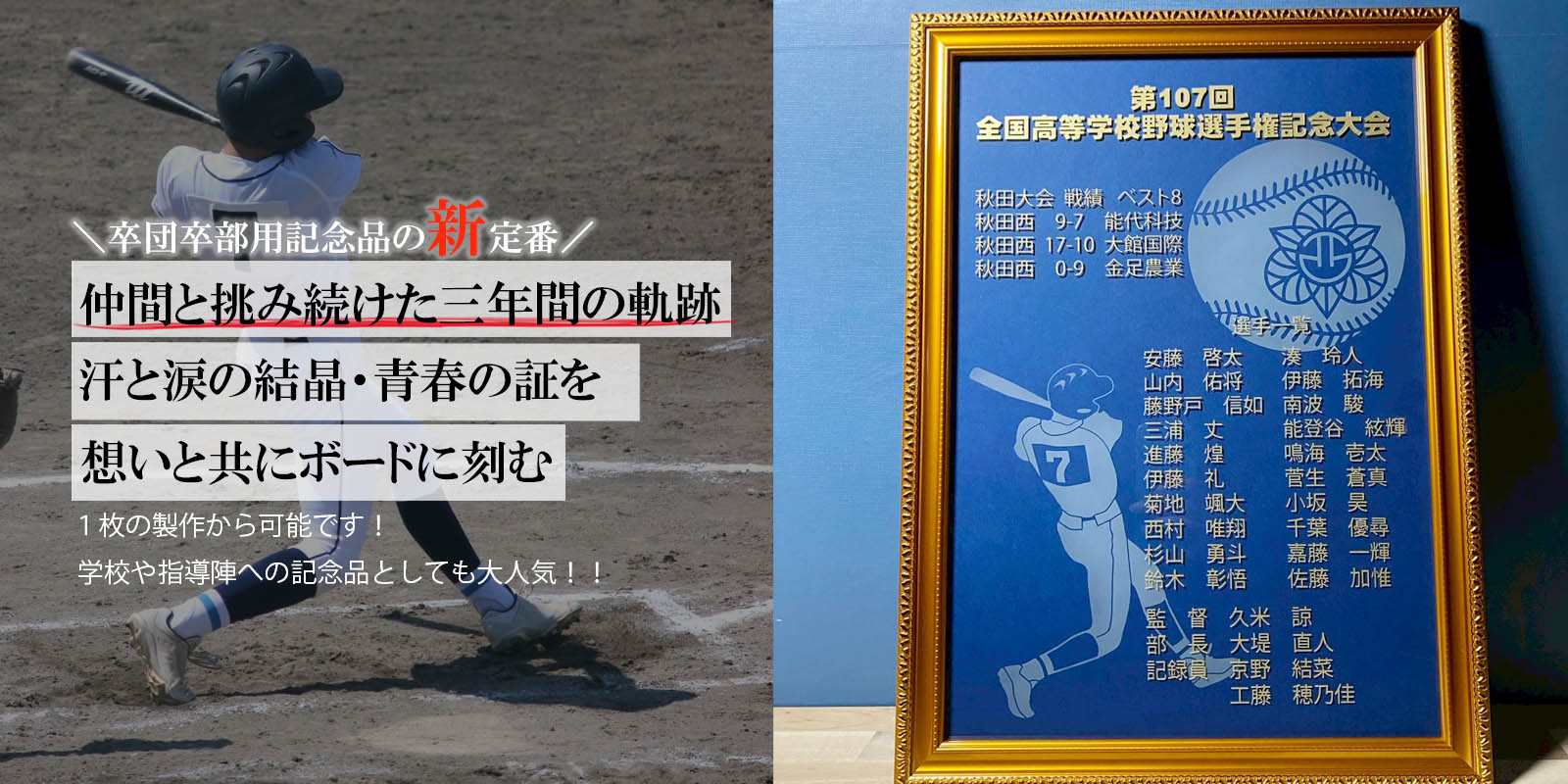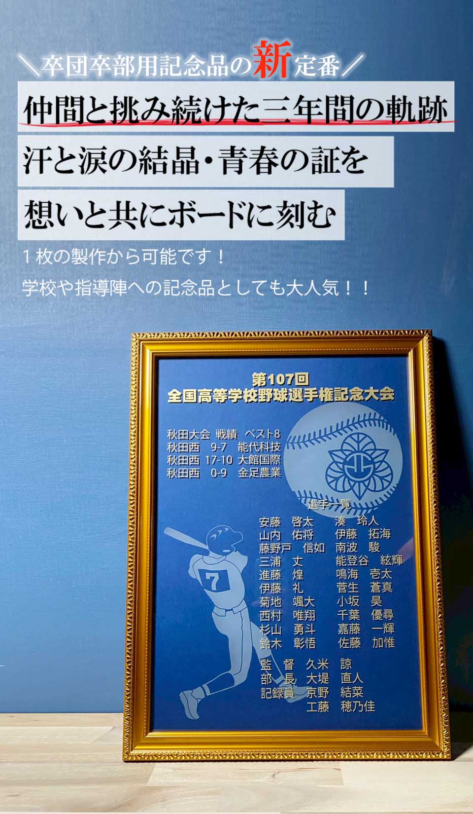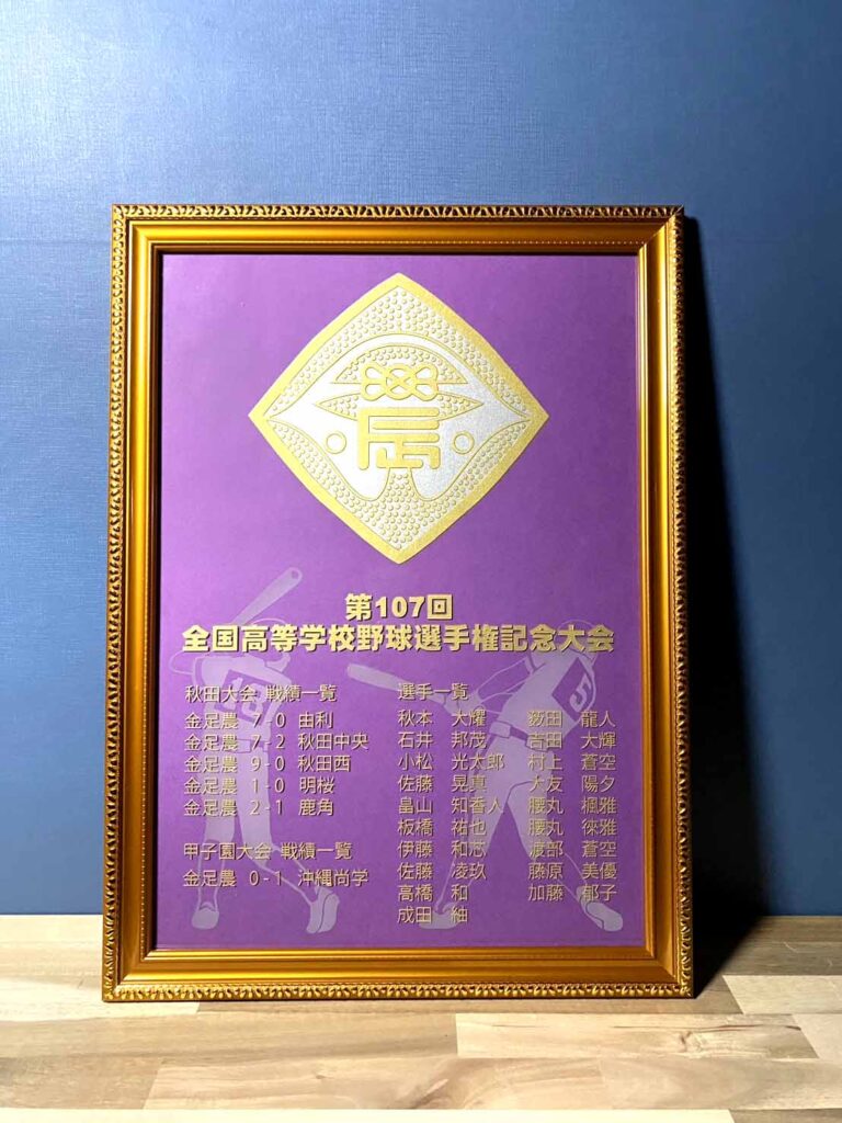 それら全ての苦楽を共にした最高の仲間達の名前・戦歴・学校名などを彫刻し、色褪せる事のない一生モノの記念品として大変ご好評を頂いております。