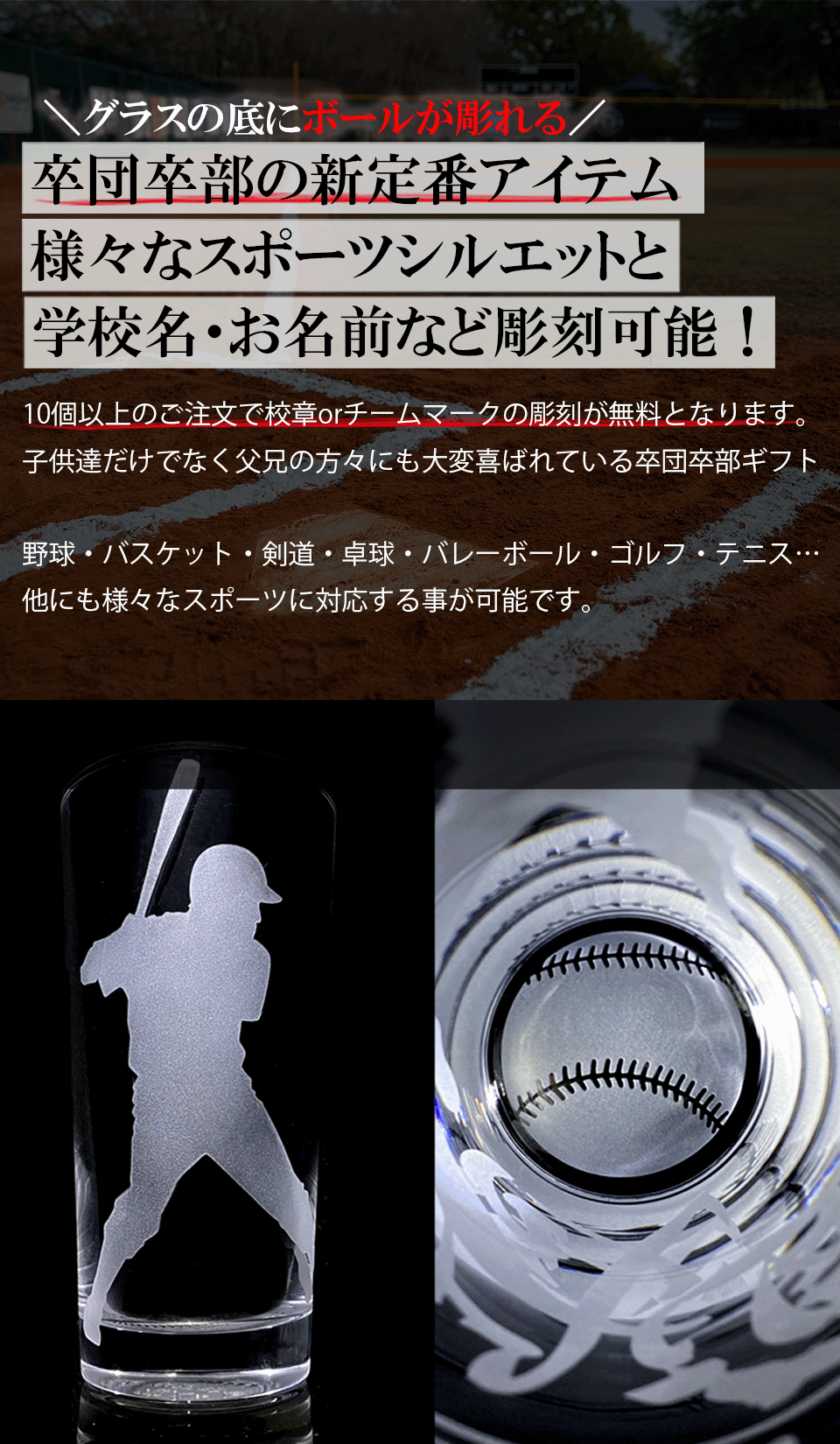 シルエット彫刻グラスが卒団卒部の記念品として大人気なのは、グラスの底面にはボールの彫刻が可能だからです。