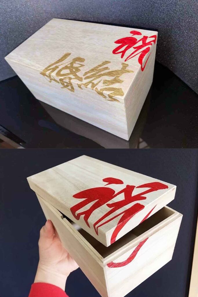 当社の桐箱彫刻は蓋の天板のみの彫刻はもちろん、他社では見た事が無いような蓋の開く部分(割り)・横側面部分にわざとかかるように2面にかけて彫刻&着色する事も可能です(画像参照)